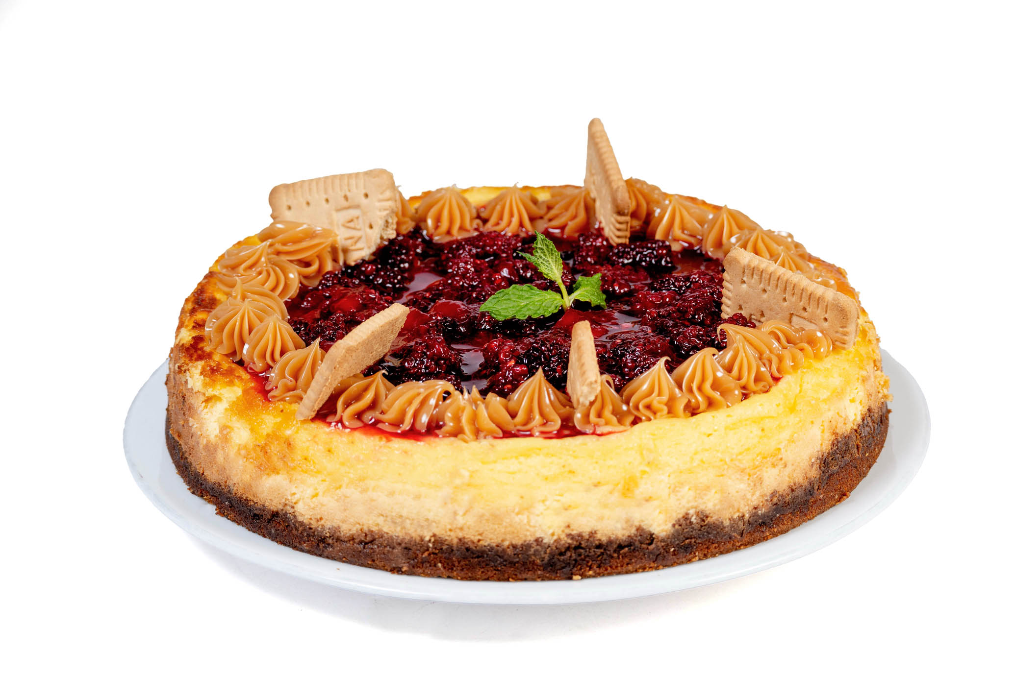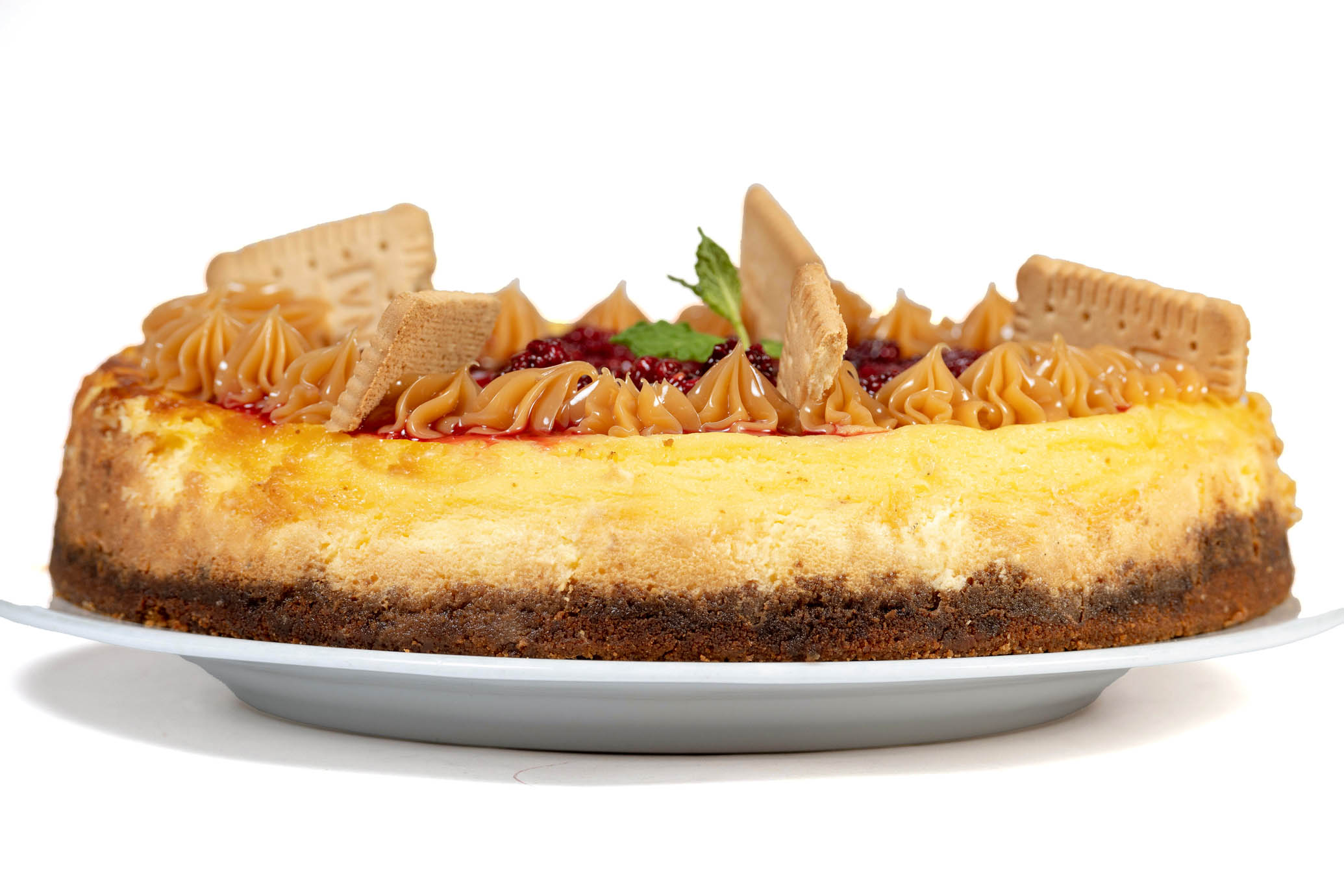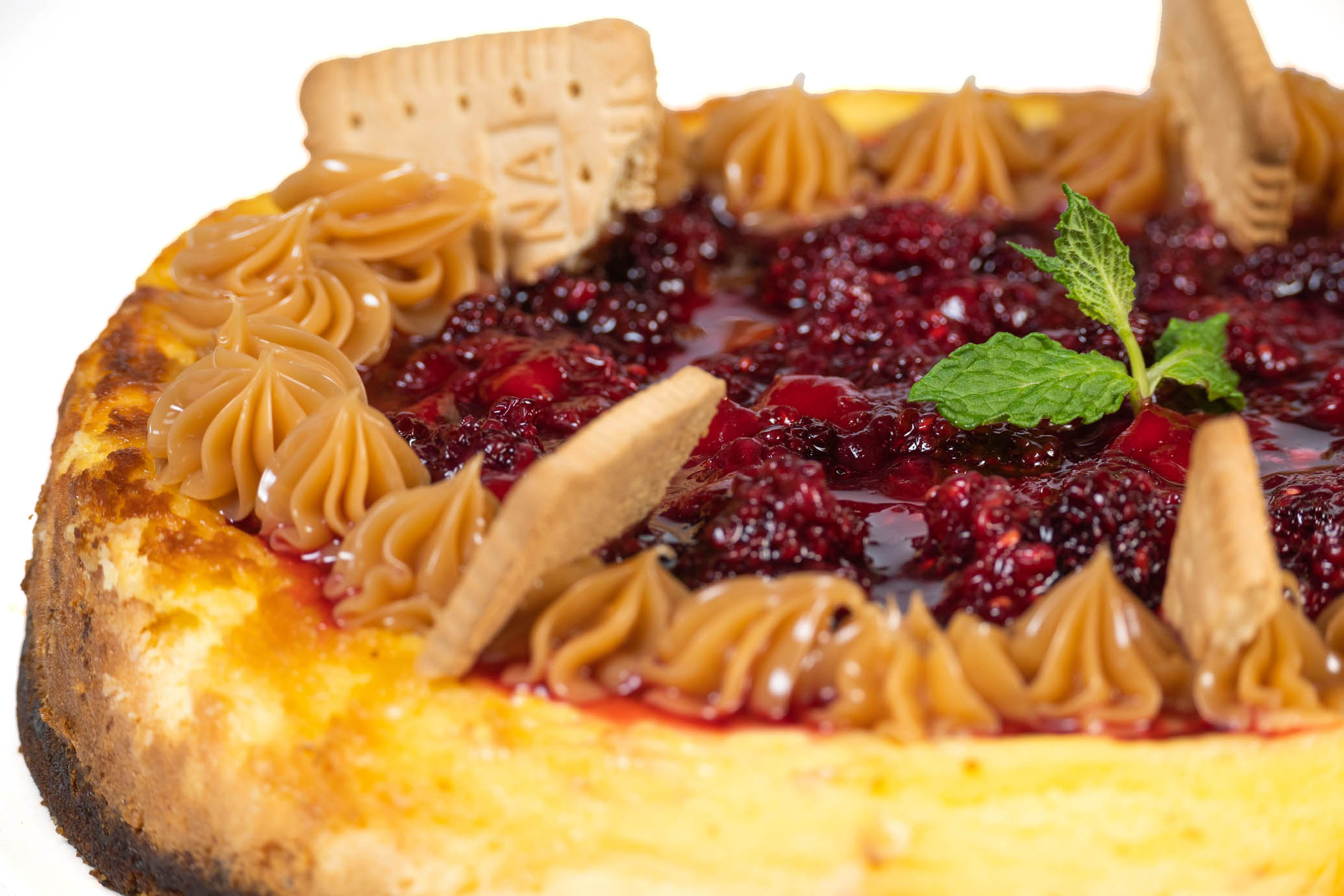 Base artesanal de masa quebrada con un delicado toque de frutos rojos y arequipe, coronada con un suave queso horneado de textura cremosa.