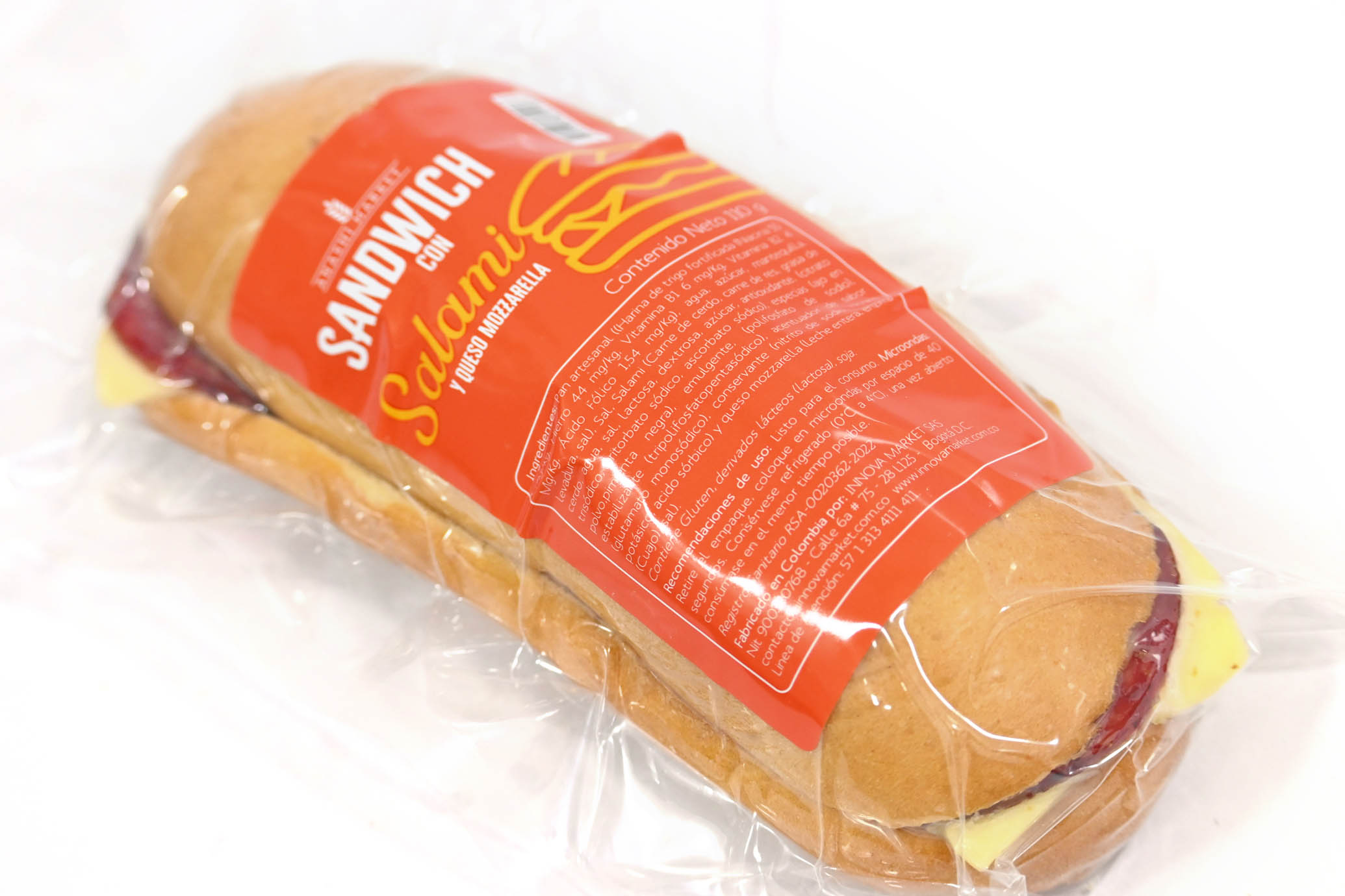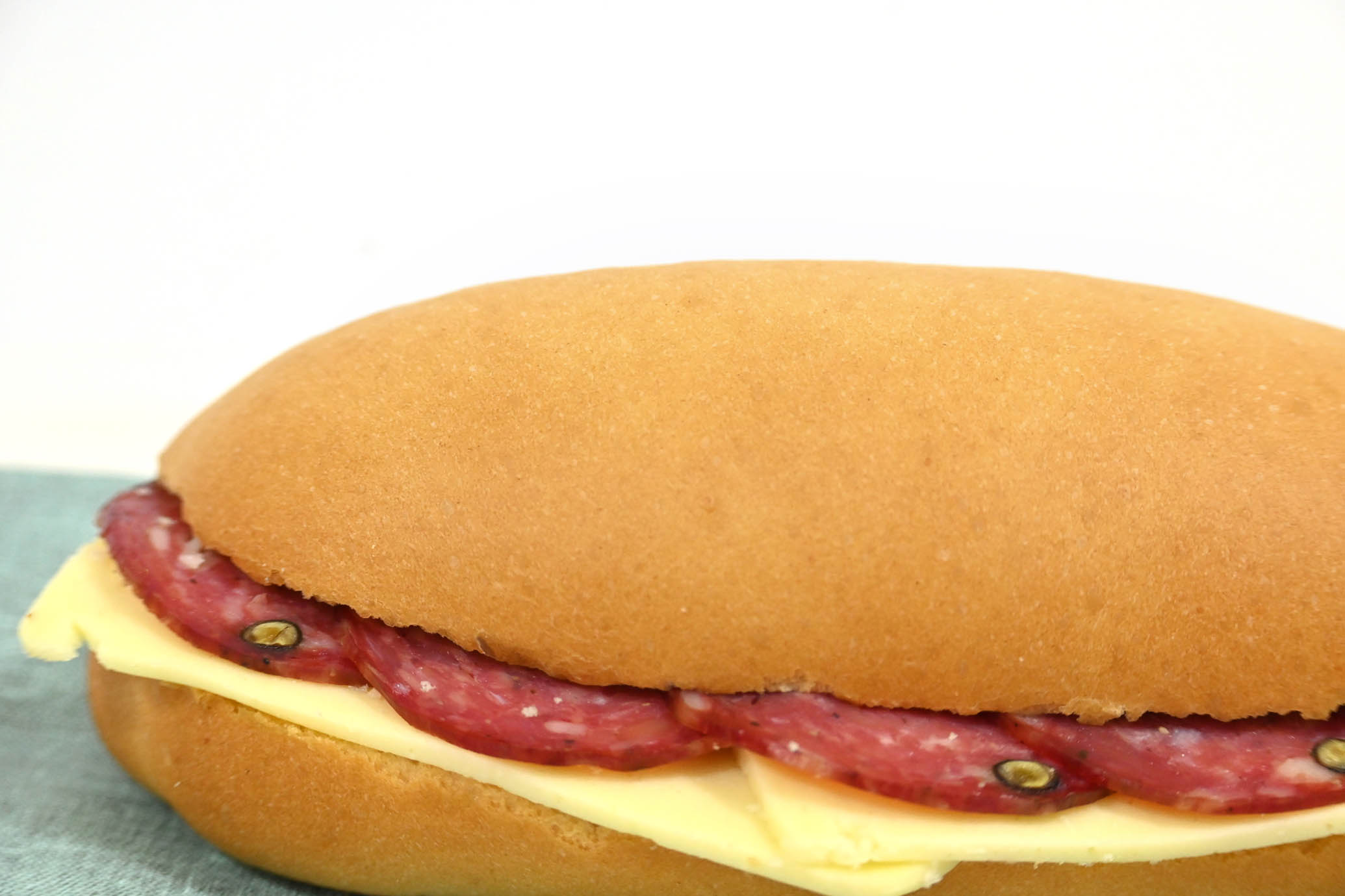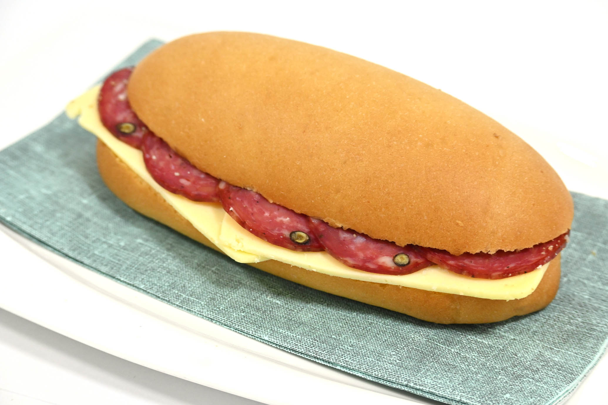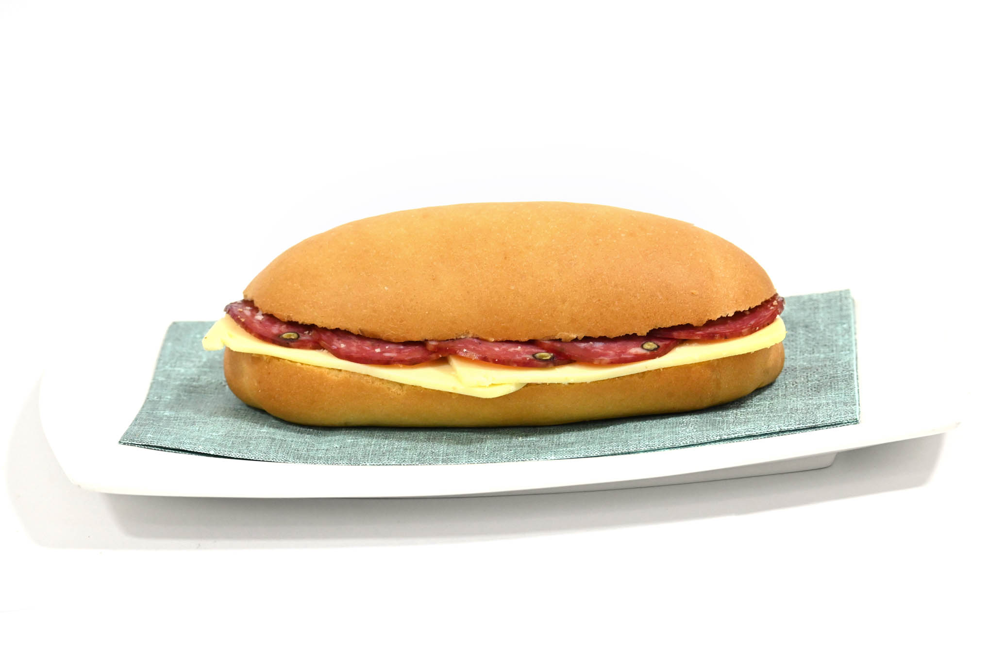 Pan artesanal con rodajas de salami y tajadas de queso blanco